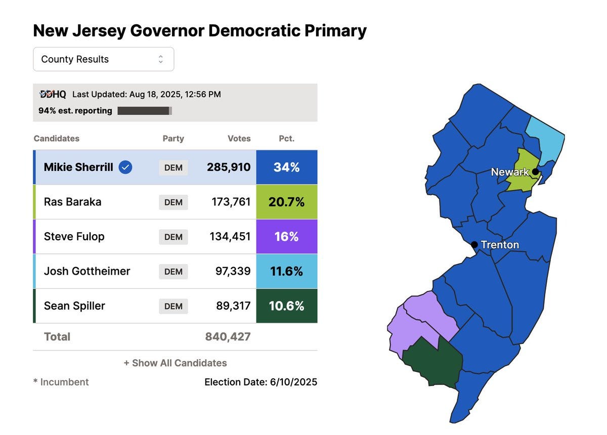 The 2025 Gubernatorial Elections are seeing Democratic centrists dominate the primaries in New Jersey as well as Virginia.