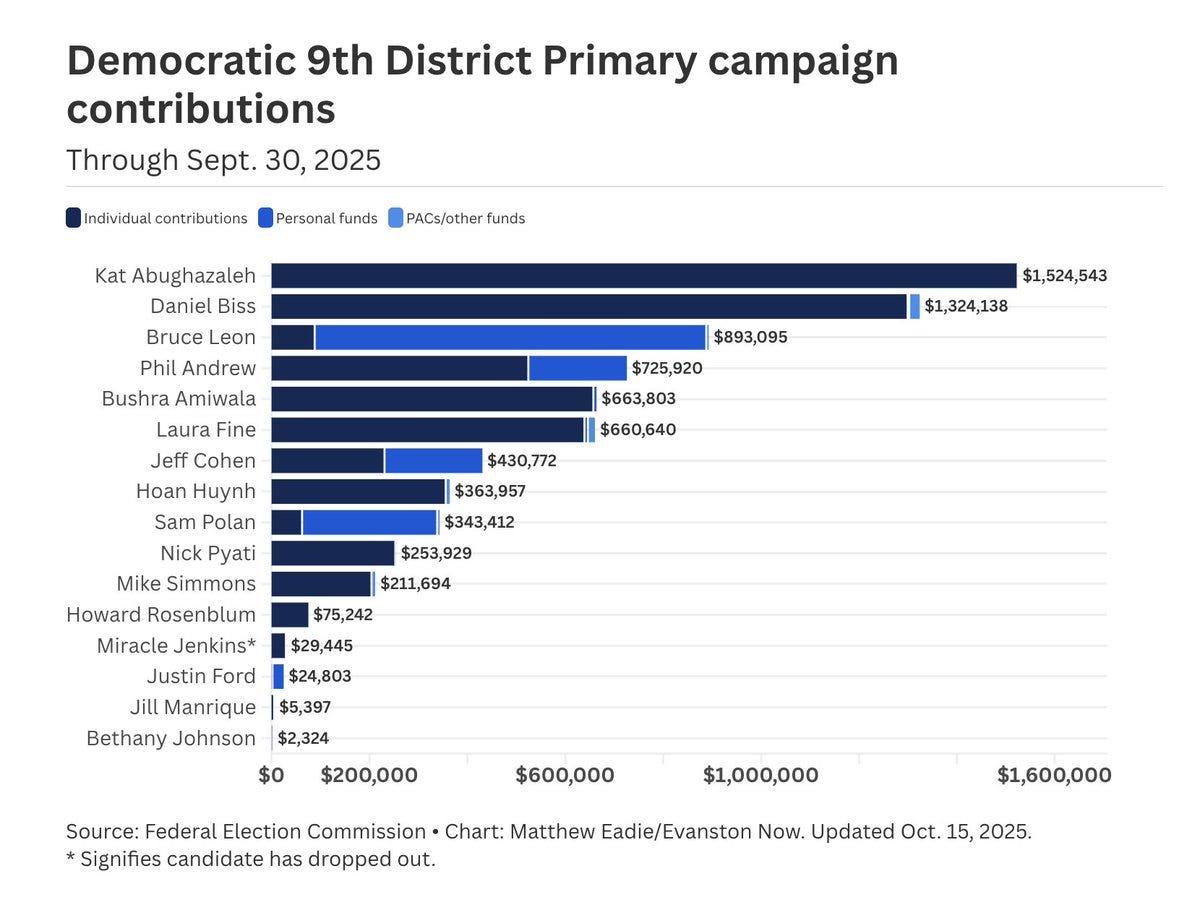 Now there are about 20 Democrats in the primary, including Daniel Biss, the Mayor of Evanston who has served in the U.S. Congress and ran a losing race for Governor in 2018, but Abughazaleh is still leading the money race — a huge feat for a first-time netroots candidate.
