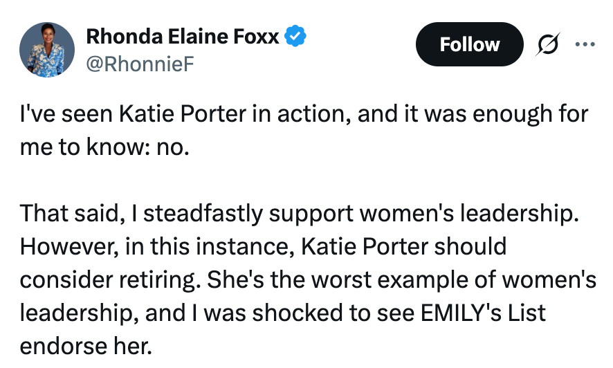 In 2024, Porter ran for U.S. Senate where she came in third in the non-partisan primary which saw RussiaGater Adam Schiff and senescent baseball Hall of Famer Steve Garvey advance to the general election.