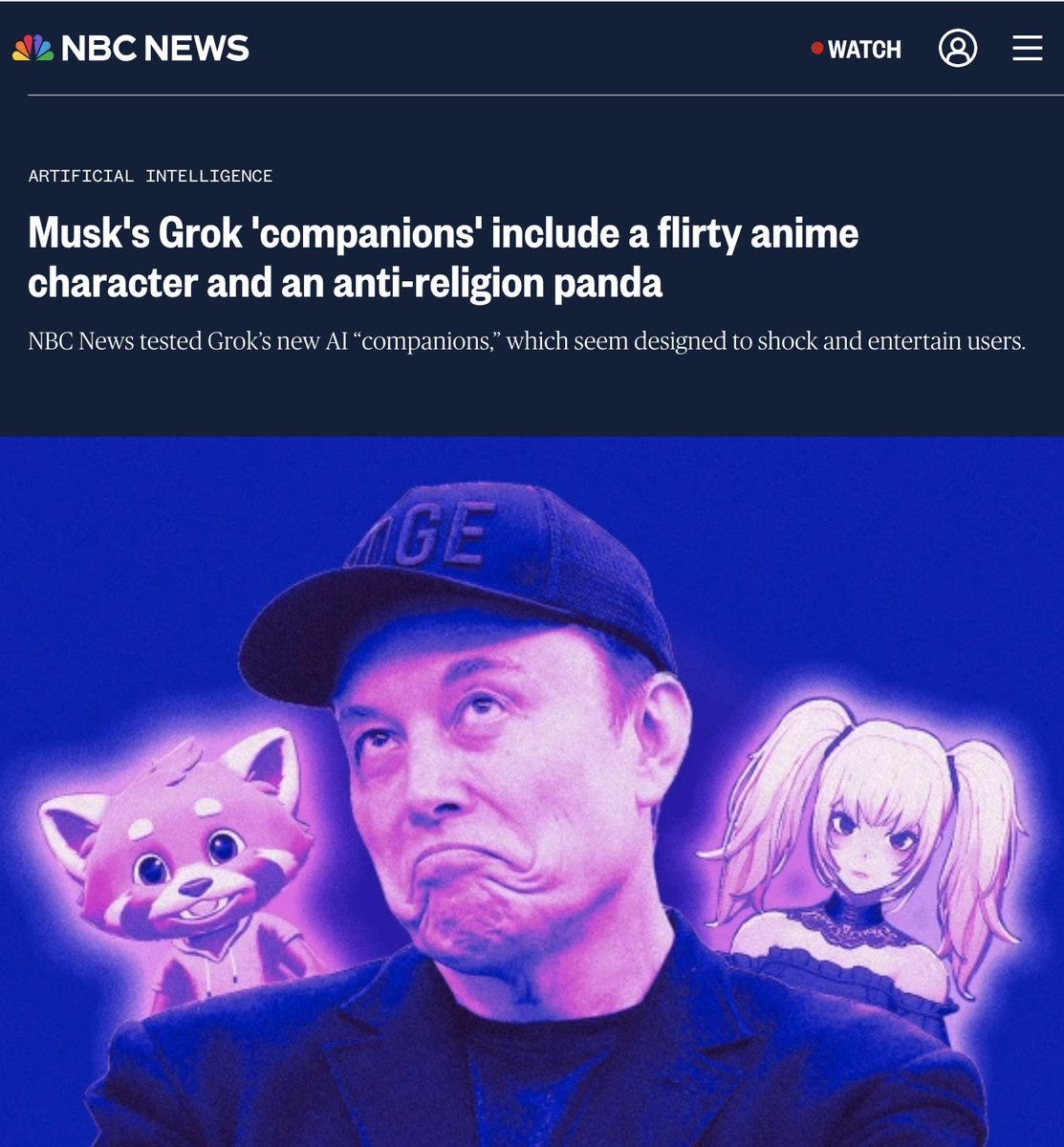 Even if he really is only hopped up on strong coffee, our boy Elon never stops working to improve his products although that doesn’t include “safety guard rails” for Grok 4 and the MSM is ready to jump on him when he pulls weird shit: