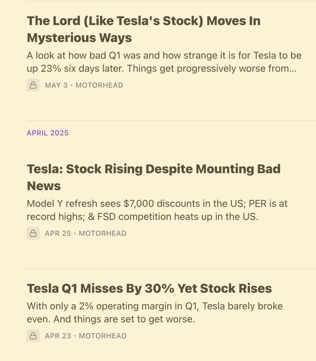 Poor guy has got to be going insane from the cognitive dissonance of documenting Musk’s abysmal management of Tesla and the Bizarro World reaction of the market.