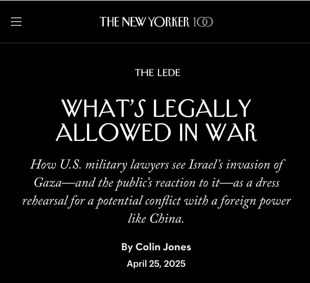 The piece starts with a portrait of “Geoffrey Corn, a law professor at Texas Tech and a former judge advocate general in the U.S. Army” where he was “the U.S. Army’s senior adviser on the laws of war, also known as international humanitarian law (I.H.L.), or the law of armed conflict (LOAC).”
