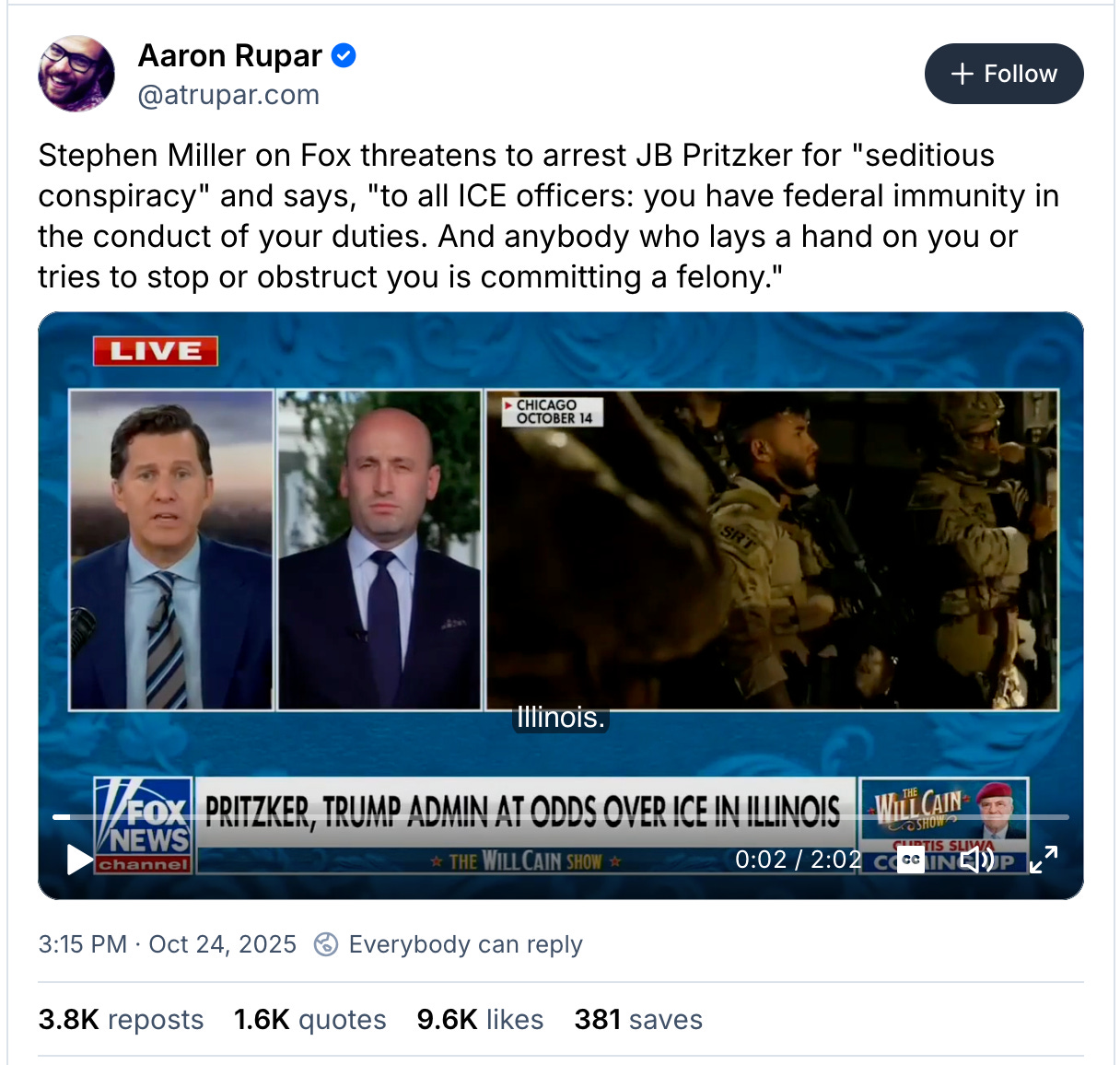 Stephen Miller on Fox threatens to arrest JB Pritzker for “seditious conspiracy” and says, “to all ICE officers: you have federal immunity in the conduct of your duties. And anybody who lays a hand on you or tries to stop or obstruct you is committing a felony.”