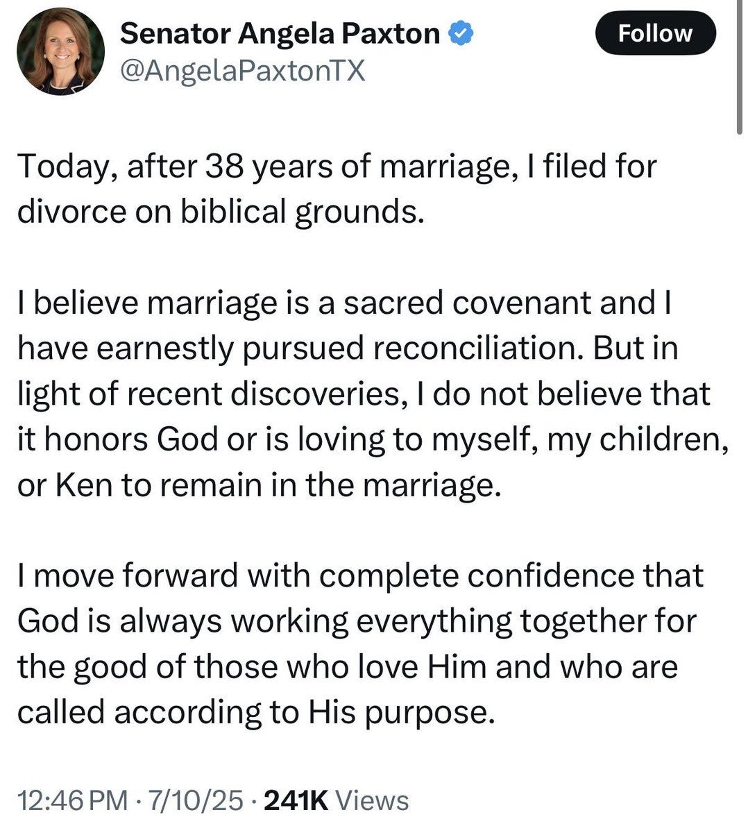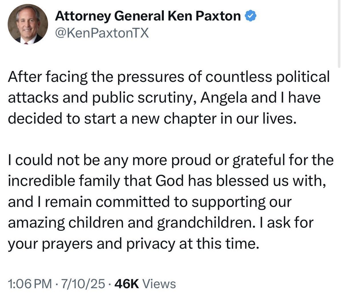 Unfortunately for Paxton, his long-suffering wife, Texas State Senator Angela Paxton filed for divorce, citing “Biblical” reasons.