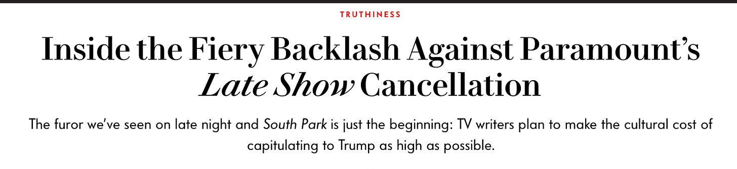 That didn’t happen here—though with Colbert said to be making between $15 million and $20 million per year, a pay cut wouldn’t have solved the problem on its own. And given the company’s willingness to fold to Trump, there’s no reason for you or me to think they would stand up to any political pressure, or resist any specific demand (which, of course, is the reason to not settle frivolous litigation…). If Chris McCarthy, Cheeks’s counterpart on the cable TV side, cancels The Daily Show in the next couple weeks, I think we’ll have a good idea what’s going on. But for now, I cautiously (and skeptically) believe that this was mostly an economic decision.